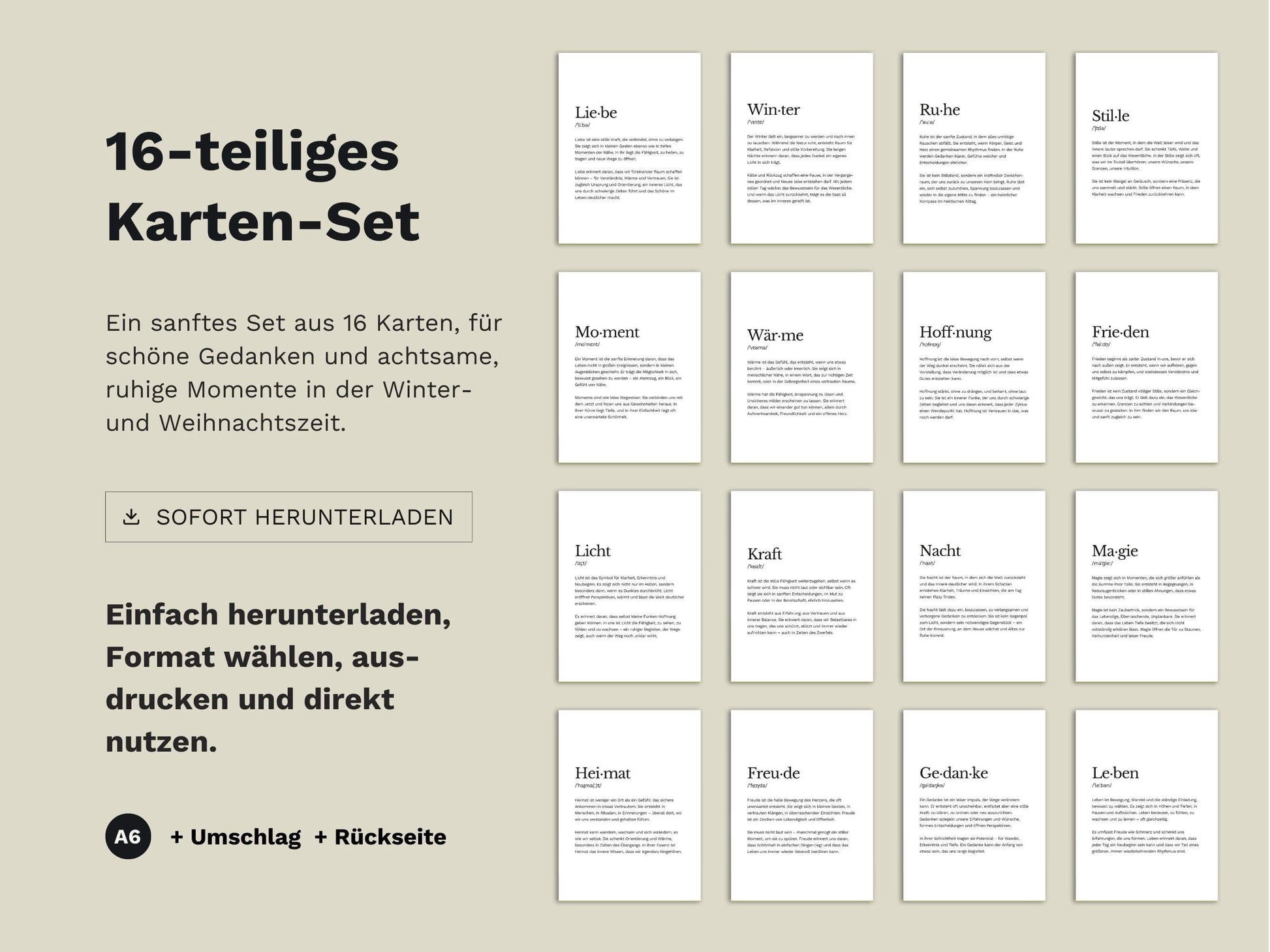 Dieses Karten-Set umfasst alle 16 Motive der „Wintersehnsucht“-Kollektion. Jede Karte trägt ein Wort, das durch die dunklere Jahreszeit begleitet – von Liebe über Hoffnung bis hin zu Kraft und Leben. Ideal zum Verschenken, Verschicken oder als kleine tägliche Erinnerung.